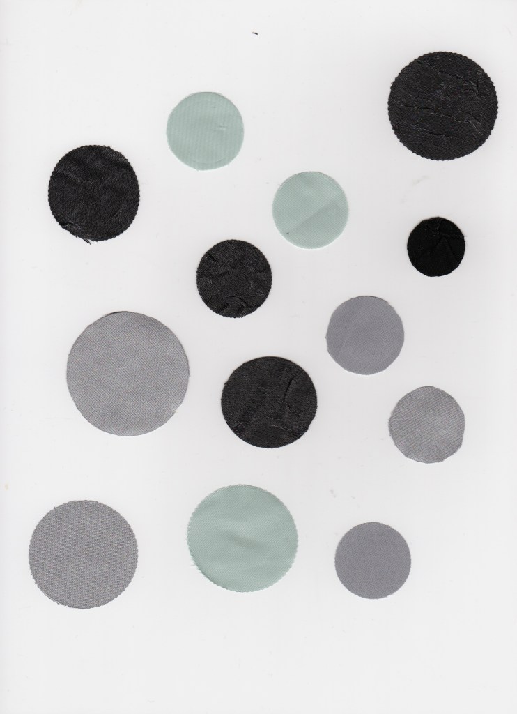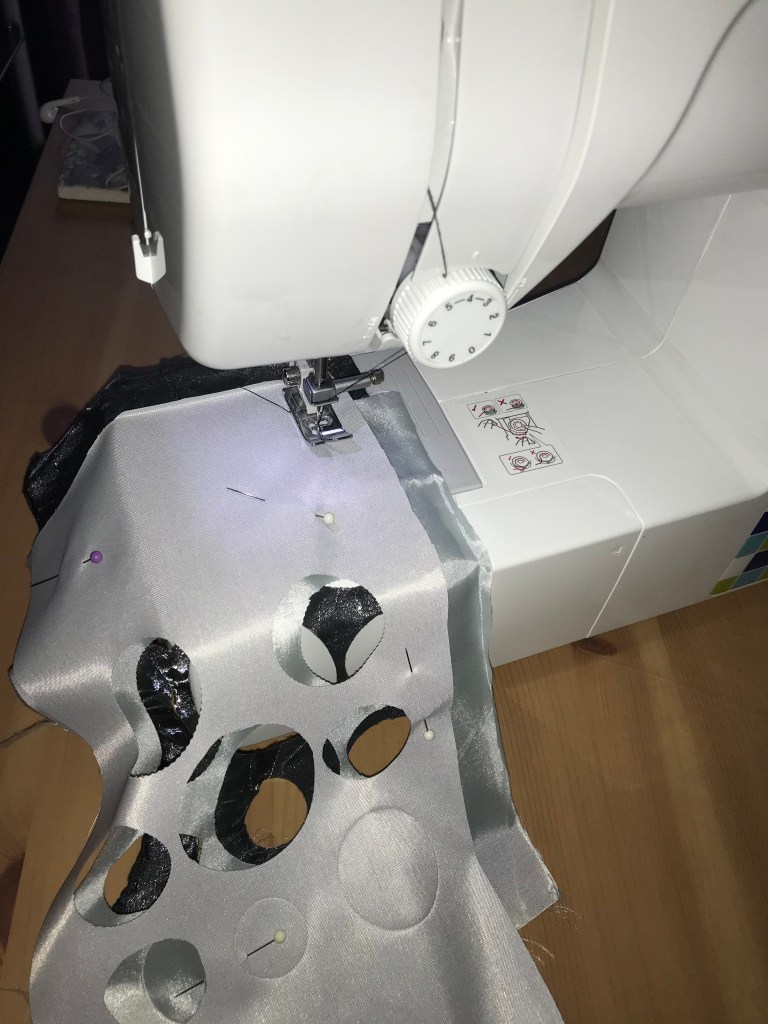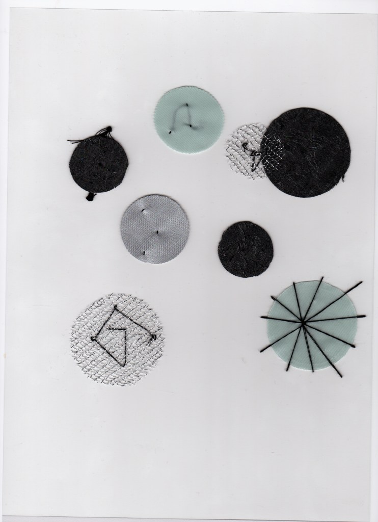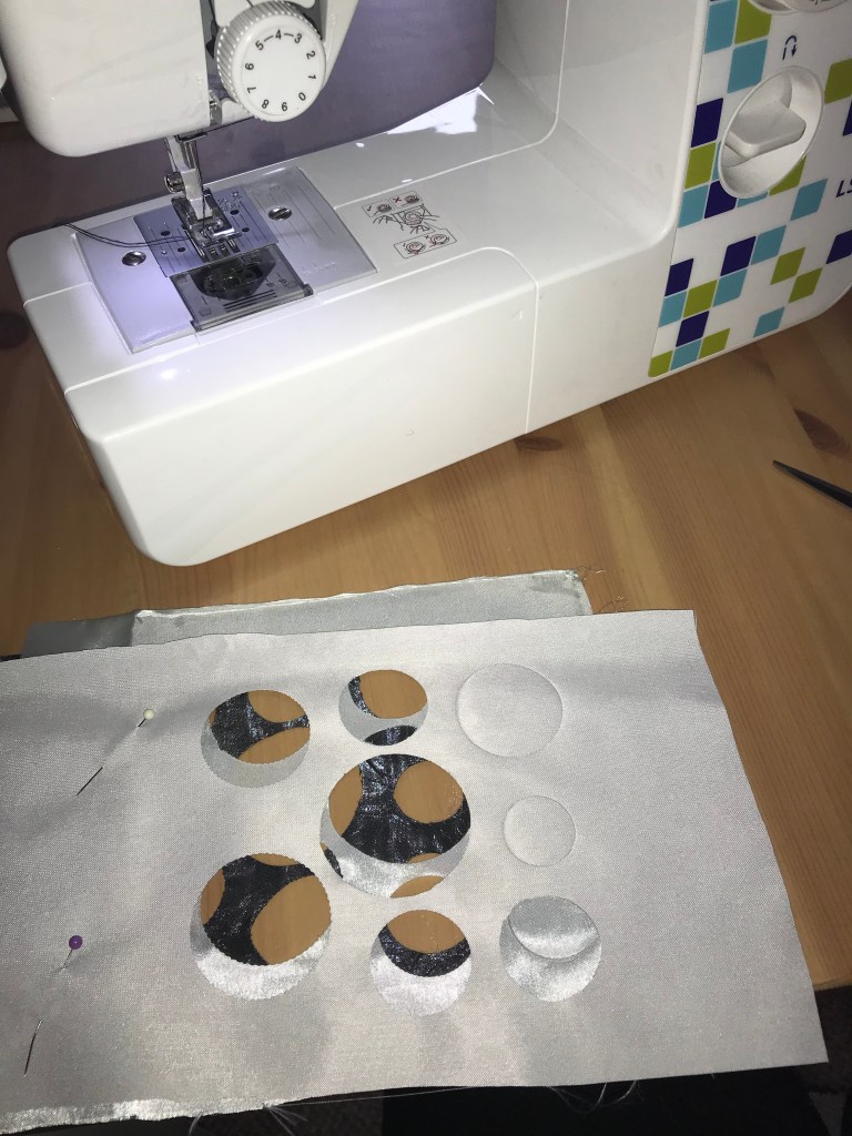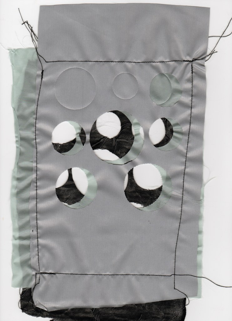 I have cut out circles from fabric to represent the bubbles. I really liked the cut-out fabric that I used and layered them over each other to see what effect that would make. With the circles, I have sewn some to acetate and made them attached to a clear background, as I wanted the lines to be coming off the fabric to appear spiked.