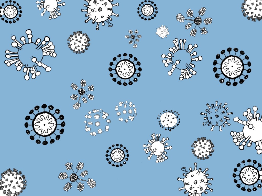 Above, I have taken a blue from the NHS logo and experimented with colouring in the cells. I didn’t think this was very effective as the cells themselves aren’t blue. I then made the blue a pastel based blue and coloured in the background. This works better and I think it looks effective – there’s something about the way the cells are floating around on a blue background that makes it seem quite calming, and safe. This could represent the NHS itself – these little covid-19 bubbles could be people all floating around in this community of self-isolation.