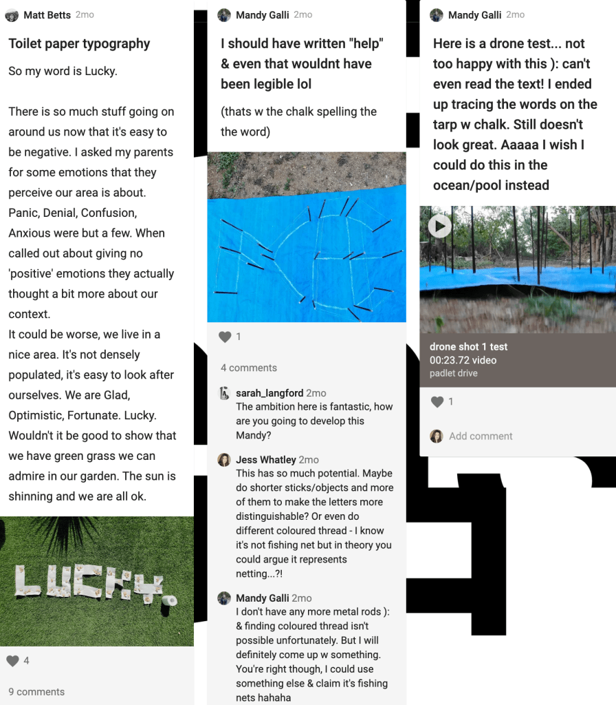 Image: I thought Mandy’s work this week was brilliant – the way she went out and thought completely beyond the box. It’s also a really interesting perspective on the outcome – an aerial view. This is something I have never considered so that’s really opened my eyes! I also saw so much potential – Mandy could have used a cork board and thread to make a mini version of her lettering. I also really appreciated Matt’s development this week – the outcomes are brilliant from using the sound waves to enhance the meaning of toilet roll!